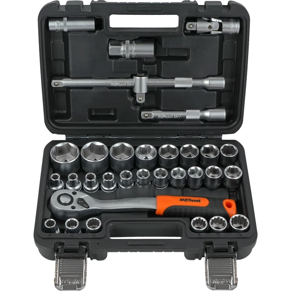 Набор инструментов AV Steel AV-011032 состоит из 32 предметов, собранных в прочный пластиковый кейс. Комплектация включает шестигранные и двенадцатигранные головки размером от 8 до 32 мм, свечные головки на 16 и 21 мм, трещотку 1/2″ с 72 зубьями и минимальным углом хода 5°, два удлинителя (125 и 250 мм), карданный шарнир и переходник 3/8″–1/2″.Трещотка оснащена эргономичной двухкомпонентной рукояткой с противоскользящим покрытием, что обеспечивает удобство работы даже при длительном использовании.Инструменты выполнены из прочной (Cr-V) стали, рассчитаны на значительные нагрузки и подходят для профессионального применения. Компактный кейс обеспечивает удобное хранение и порядок.