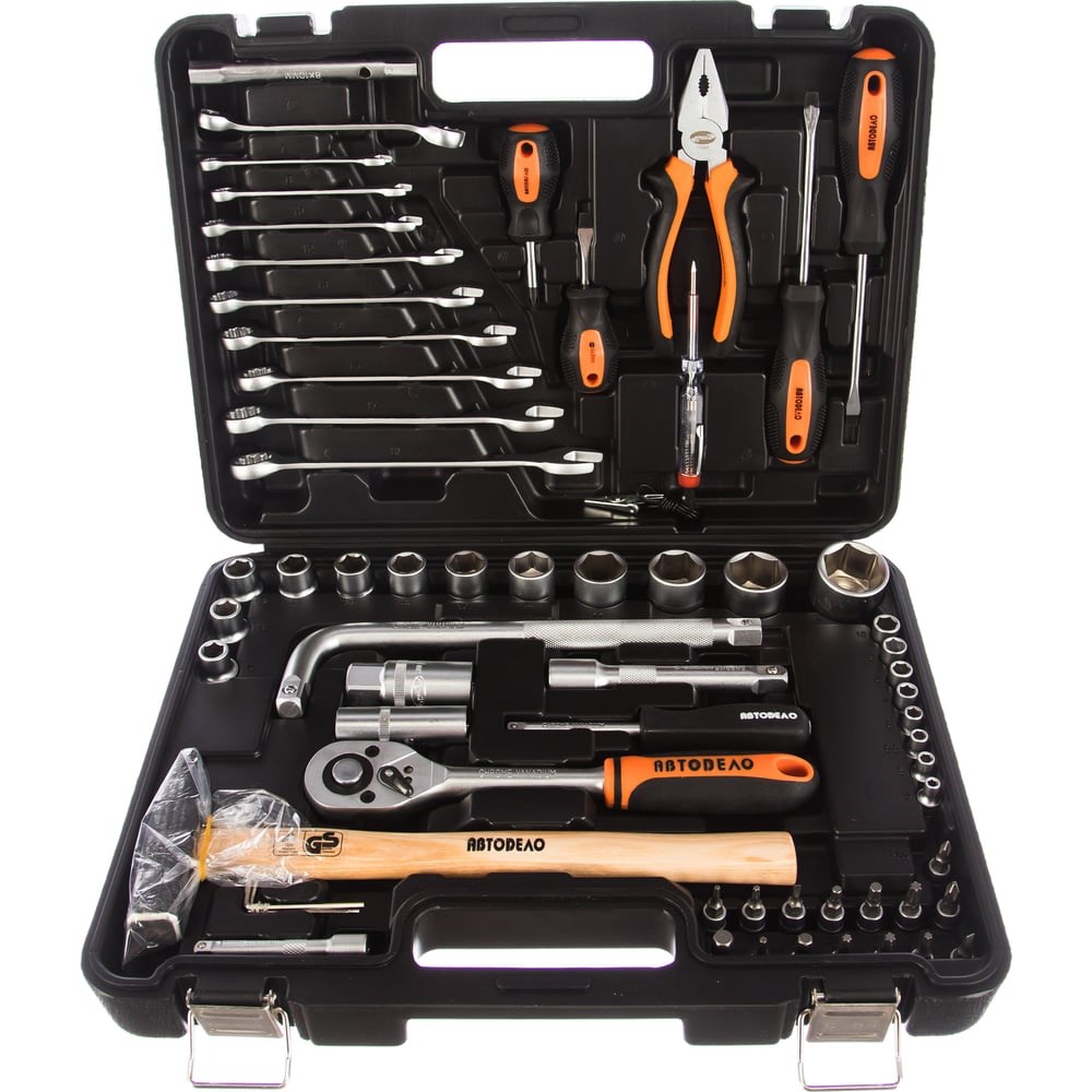 Набор инструмента АвтоDело 1/2" DR 1/4" DR 64 предмета 39860 13418 предназначен для частного и профессионального использования. Комплект оптимизирован для проведения ремонтных работ, связанных с автомобилем. Ключевые особенности: набор содержит насадки с шестигранным профилем; имеются ключи с присоединительными квадратами двух типов: 1/4 и 1/2 дюйма; инструмент произведен из особой хромованадиевой стали, устойчивой к нагрузкам; насадки дополнительно закалены; имеют оптимальную степень твердости — не ниже 39 HRC; защитное покрытие продлевает срок службы инструмента. Кейс, оборудованный ячейками для каждого предмета, создает комфортные условия для хранения и переноски набора.