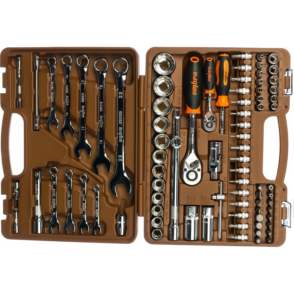 Универсальный набор инструмента с 12-гр. головками 1/2"DR и 1/4"DR Ombra OMT82S12 используется в автомастерских для работ с различными видами крепежа. Набор состоит из 82 предметов. На поверхность всех инструментов нанесено трехслойное хромоникелевое покрытие, которое легко очищается от грязи и обладает высокой коррозионной стойкостью. Для надежного хвата и комфортной работы приводы и отвертка оснащены эргономичными двухкомпонентными рукоятками. Набор поставляется в кейс из ударопрочного пластика, что гарантирует безопасное хранение и транспортировку.Преимущества• Высокое качество материалов - инструменты производятся из легированной стали, которая обеспечивает высокую прочность, надежность и устойчивость к нагрузкам. Набор поставляется в пластиковом ударопрочном кейсе с металлическими замками, поэтому его легко транспортировать и удобно хранить.• Современные технологии производства - для надежной защиты от химических и механических воздействий применяется технология Triple Coating – тройное покрытие из хрома и никеля с промежуточной полировкой. Зеркальное, трехслойное хромоникелевое покрытие обеспечивает изделиям не только безупречный внешний вид, который доставляет эстетический комфорт, но и облегчает удаление загрязнений после работы.• Эргономичные конструкции - продуманные решения обеспечивают удобство работы с инструментом и возможность прилагать к нему усилия, превышающие расчетные• Высокое качество инструментов – инструменты изготовлены в соответствии с условиями международных стандартов, полностью соответствует ГОСТам и имеют пожизненную гарантию от производителя.