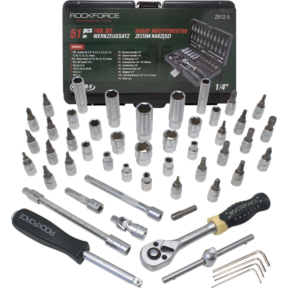 Универсальный набор инструментов ROCKFORCE 1/4", 51 предмет в кейсе. Изготовлен из хром ванадия CR-V - прочный и надежный инструмент.Универсальность. Набор применяется для мелкого ремонта на СТО, в гараже, в дороге, на даче и дома в быту - станет вашим незаменимым помощником. Подойдет автолюбителям при мелком ремонте: заменить лампочку, открутить панель, хомут и подобное. Удобная комплектация с торцевыми шестигранными короткими головками разных размеров.Многопрофильность. Подходит для ремонта легковых и грузовых автомобилей мототехники, квадроциклов, снегоходов, гидроциклов, спецтехники, садовой техники и прочих слесарно-монтажных работ с различным крепежом.Удобство. Для удобства хранения и транспортировки поставляется в прочном пластиковом кейсе с металлической защелкой. Набор станет незаменимым помощником в любой работе. Профессиональный инструмент - гарантия качества!Многопрофильность. Данный набор - это отличный подарок мужу, отцу, коллеге на любой праздник.