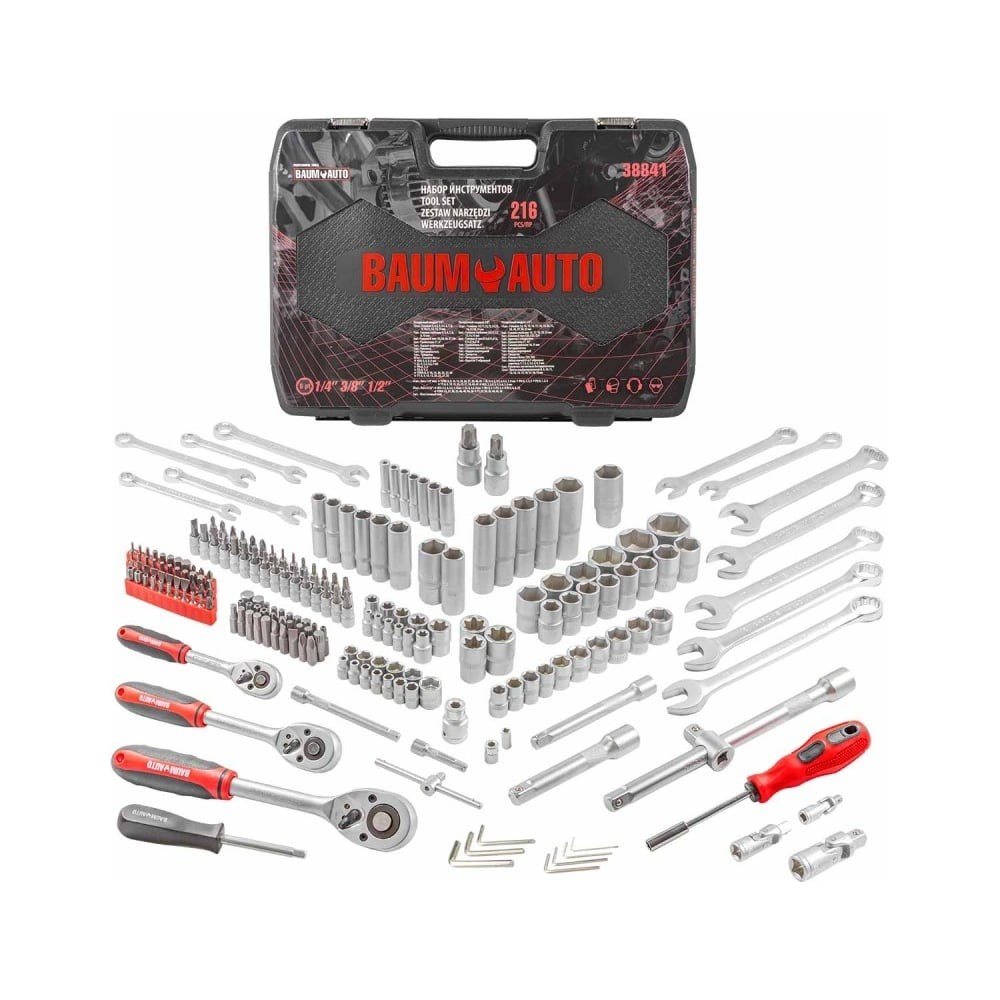 Набор инструментов BaumAuto из 216 в кейсе - профессиональный инструмент с гарантией качества.Набор применяется для ремонта на СТО, мастерских, производствах, в гараже, в дороге, на даче и дома в быту. Все его составляющие изготовлены из особо прочной легированной стали и могут применяться для производства работ повышенной сложности, создающих предельно высокие нагрузки на инструмент. В комплект входит удобный кейс, который легко поместится в багажник вашего авто.Кроме того, этот набор инструментов идеально подходит для использования дома. Будь то небольшой ремонтный проект или крупное строительство, этот комплект поможет вам быстро и легко завершить любую работу. Инструменты выполнены из высококачественных материалов, чтобы обеспечить долговечность и надежность.
