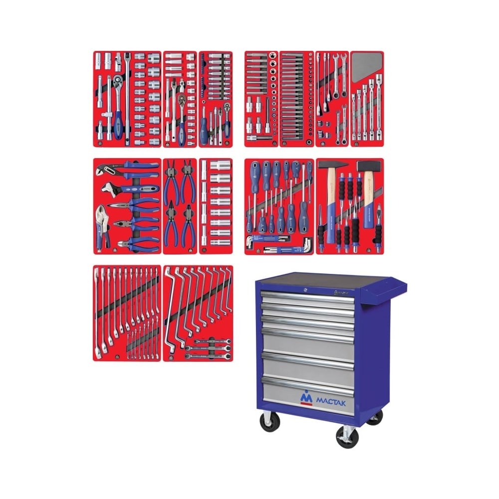 Набор инструментов ЛИДЕР 270 предметов МАСТАК 52-06270B в синей тележке поможет справиться с любыми работами в автомастерской. Комплект включает в себя головки на три основных размера посадочного квадрата, комбинированные ключи и многое другое. Инструменты поставляются в металлическом ящике на колесах, что упрощает хранение и перемещение оборудования. Для сохранности содержимого имеется центральный замок. Все инструменты разделены на 14 ложементов. Размеры полок: Полка 1-3: 580 х 406 х 75; Полка 4-6: 580 х 406 х 150.