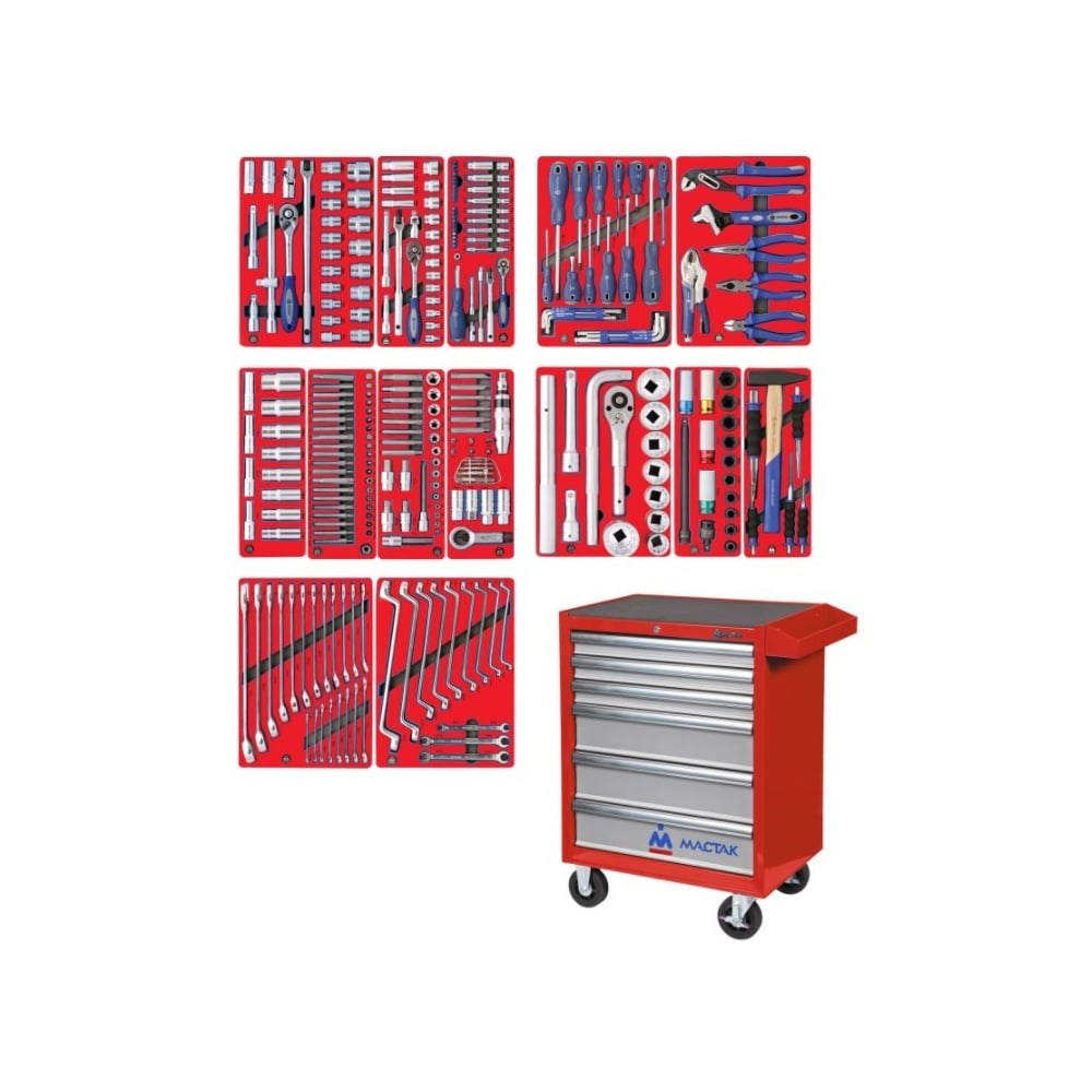 Набор инструментов ПРОФИ 299 предметов МАСТАК 52-06299R в красной тележке используется в автомастерских и при проведении различных ремонтно-монтажных работ. Наличие нескольких ложементов позволяет отсортировать инструмент по назначению, что существенно упрощает его применение. Изначально имеется одна свободная полка, которая впоследствии заполняется по усмотрению владельца. Тележка на четырех колесах проста в использовании и удобна при перемещении. Наличие отделения для мелочей в вверху изделия позволяет работать с крепежом более эффективно. Размеры: Полка 1-3: 580 х 406 х 75; Полка 4-6: 580 х 406 х 150.