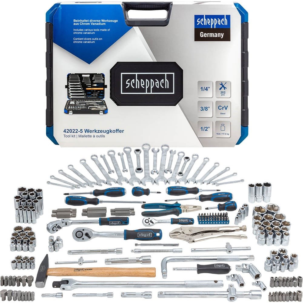 Набор инструментов для автомобиля от немецкого бренда Scheppach, состоящий из 202 предметов, оптимально подходит для использования на СТО, в мастерских, на производстве, в гараже, на даче и дома. Немецкое качество. Все инструменты изготовлены из высококачественной хромованадиевой стали(CR-V), что обеспечивает качество и надежность, что гарантирует стабильную работу даже при высоких нагрузках. Многофункциональность. Набор из 202 предметов, включая торцевые головки различных размеров, свечные головки, головки-биты, удлинители, шарнирные карданы и шестигранные ключи. Это позволяет справиться с широким спектром задач — от обслуживания автомобиля до сборки мебели и строительства. Универсальность. Благодаря наличию в наборе различных посадочных размеров (1/4 дюйма 1/2 дюйма 3/8 дюйма), инструменты подходят для выполнения как мелких, так и крупных ремонтных работ. Набор будет хорошим помощником в любой ситуации — замена свечей зажигания, работы с подвеской автомобиля или мелкие бытовые починки. Удобство использования. Все инструменты аккуратно упакованы в прочный пластиковый кейс с металлическими защёлками. Каждый предмет имеет свою ячейку, которая позволит легко его найти в нужный момент и поддерживать порядок.