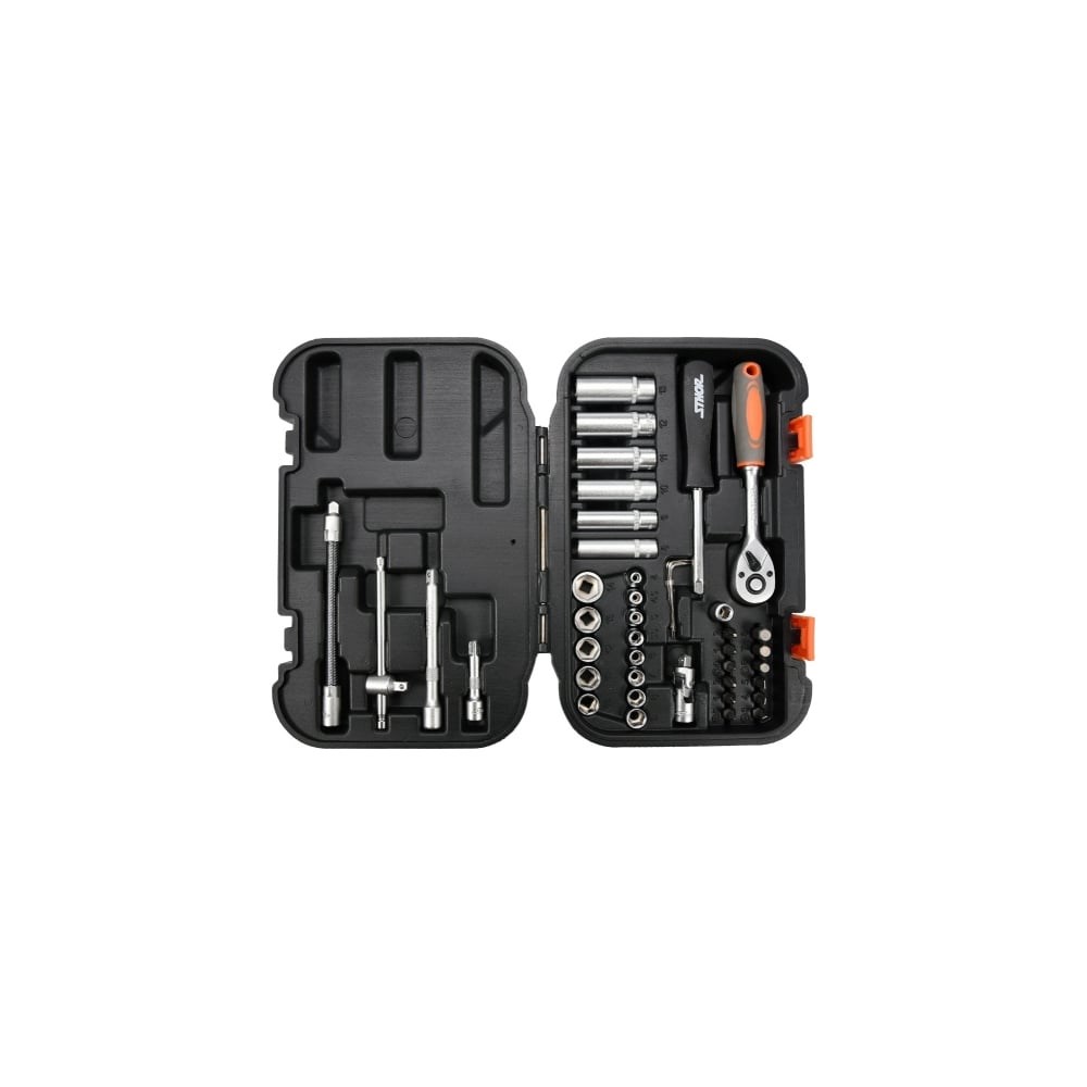 Набор инструментов STHOR 1/4 42 предмета пластиковый кейс 58641 подходит для широкой сферы применения, которая включает в себя: автомастерские; сборочные производства; мелкие и крупные предприятия. Комплектация включает в себя большое количество различной оснастки для работы со сложным крепежом, в том числе удлинители, карданы и адаптеры. Все инструменты изготовлены из хромванадиевой стали CrV 50BV3 твёрдости 45-47 HRC. В качестве дополнительного усиления использованы термообработка и холодная ковка. Для работы с крепежом формата внутренний шестигранник есть 3 угловых ключа. Вороток подойдет для затягивания винтов.