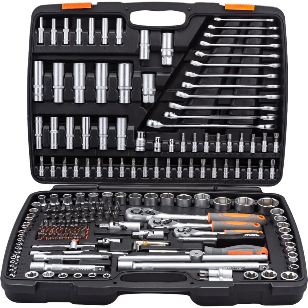 Набор инструментов STHOR 1/2 216 предметов пластиковый кейс 58691 подходит для широкой сферы применения, которая включает в себя: автомастерские; сборочные производства; мелкие и крупные предприятия. Комплектация включает в себя большое количество различной оснастки для работы со сложным крепежом, в том числе удлинители, карданы и адаптеры. Все инструменты изготовлены из хромванадиевой стали CrV50BV30 твёрдости 45-47 HRC. В качестве дополнительного усиления использованы термообработка и холодная ковка. Инструмент удобно переносить благодаря прочному пластиковому кейсу с двумя защелками.