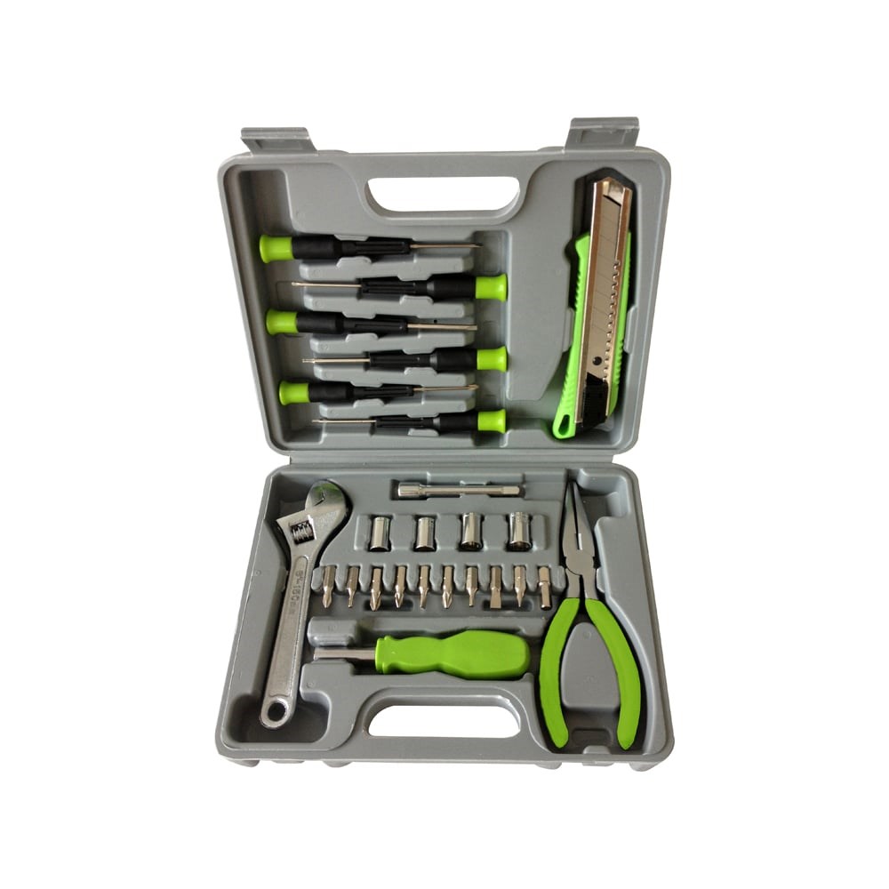 Набор инструментов 25 предметов (230x50x180 мм, тёмно-серый) Stinger W0405 поставляется в прочном и удобном пластиковом кейсе. Основной и вспомогательный инструмент разделен по обеим крышкам кейса. В наборе имеются удобные длинногубцы и разводной ключ. К отверточной рукоятке полагается 9 бит и 4 головки. Для большего удобства работы с крепежом имеется удлинитель и адаптер для четырехгранника. Точные отвертки подойдут для работы с электроникой. Безопасность транспортировки обеспечивается наличием двух пластиковых замков.