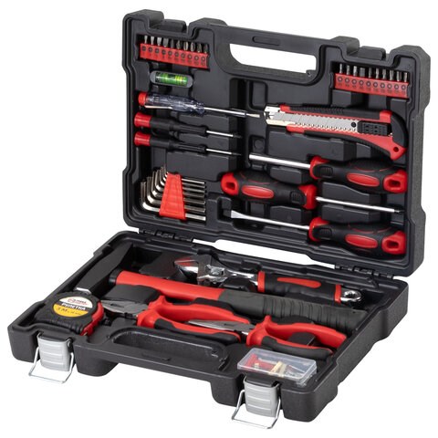 Инструменты изготовлены из закалённой углеродистой стали. Рукоятки выполнены из нескользящего ПВХ для максимального комфорта и безопасности во время использования. В состав набора входят инструменты, необходимые в столярно-слесарном деле, для ремонта автомобиля и любой колесной техники, бытовой техники, а также мебели.