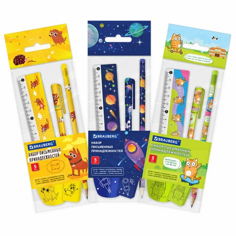 Набор канцелярский №2 (ручка шариковая, карандаш чернографитный, ластик, линейка, точилка), BRAUBERG, ассорти, 144255