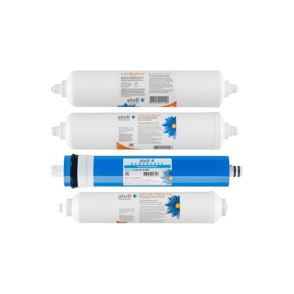 Atoll № 114m STDA - полный набор картриджей для 4-х ступенчатых фильтров Atoll: Slim A-4200m STDA Картридж atoll MK-5633C-5 мкм для механической очистки питьевой воды: Префильтр для компактных систем обратного осмоса. Фильтрующий слой из полипропилена. Цилиндрический корпус из пищевого пластика. Быстросъёмные соединения In-Line. Удаляет песок, грязь и др. твёрдые частицы размером более 5 микрон. Принимает первый удар грязи на себя. Уменьшает мутность и цветность фильтруемой воды. Угольный картридж atoll CK-5633C (1/4) для систем обратного осмоса для удаления хлора и органики. Мембрана Atoll TW40-2012-200 для систем обратного осмоса устанавливается в корпус стандартного размера 1812. Производительность 200 галлонов в сутки. Тонкость фильтрации 0.0001 микрон. Постфильтр atoll GS-10CAL-RO используется для минерализации питьевой воды, очищенной методом обратного осмоса. Подключается с помощью быстросъёмных соединений In-Line (1/4"). Содержит комбинированную засыпку из кальцита и активированного угля. Кальцит насыщает воду полезными солями кальция и уменьшает избыточную кислотность (коррекция pH). Активированный уголь кондиционирует и освежает питьевую воду.