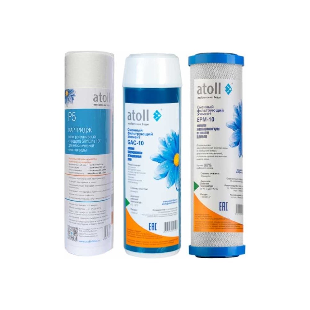 Набор картриджей Atoll №203 STDA предназначен для замены использованных элементов в системах обратного осмоса - A-550E, A-560, A-560Е, A560Em, A-560Ecp, A-575, A-575E, A-575Em, A-575Ecp (для сильно хлорированной воды, удаление запаха хлора) Содержит три предфильтра. Рекомендуемый срок замены: 6 месяцев. Набор картриджей Atoll №203 STDA содержит: Картридж atoll P5 (полипропилен) для очистки воды от механических примесей. Обладает высокой устойчивостью к воздействию бактерий и химикатов. Задерживает частицы размером более 5 мкм Картридж atoll GAC-10 (гранулированный активированный уголь) предназначен для устранения механических, органических и хлорорганических примесей. Задерживает частицы размером более 20 мкм Картридж atoll EPM-10 (прессованный активированный уголь) предназначен для устранения механических примесей. Задерживает частицы размером крупнее 10 мкм. Улучшенные показатели очистки от хлора