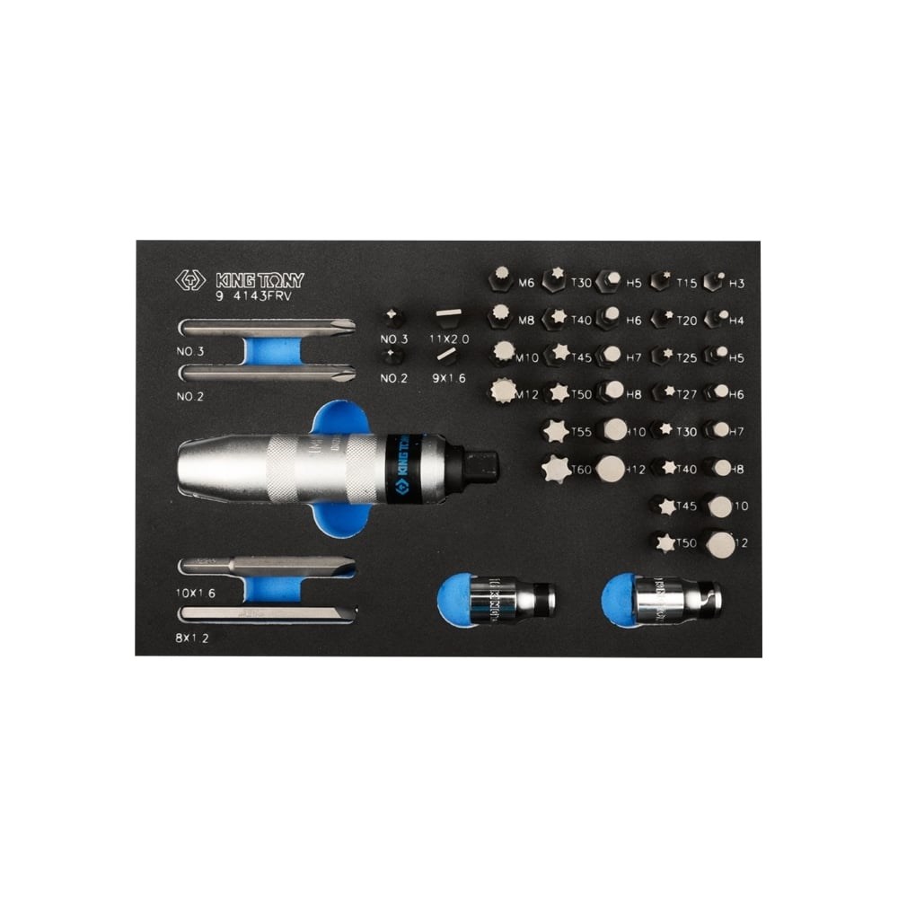 Набор, ложемент, 43шт KING TONY 9-4143FRV состоит из прочной отвертки, которая подходит для ударных нагрузок, а также комплекта бит разнообразных профилей и размеров. Изделия служат для откручивания проблемного крепежа при демонтаже различных деталей механизмов и конструкций. При ударе по затылочной части отвертки насадка поворачивается на 1-2 мм, что обеспечивает быстрый срыв прикипевшего винта. Все компоненты данного набора удобно располагаются в ячейках ложемента, который выполнен специально для комплектации инструментальной тележки. Материалом для изготовления ложемента является EVA (ЭВА, этиленвинилацетат), который обеспечивает легкость, прочность, износостойкость, сопротивление негативным средам масел и растворителей, а также быстрое восстановление прежней формы после деформации.