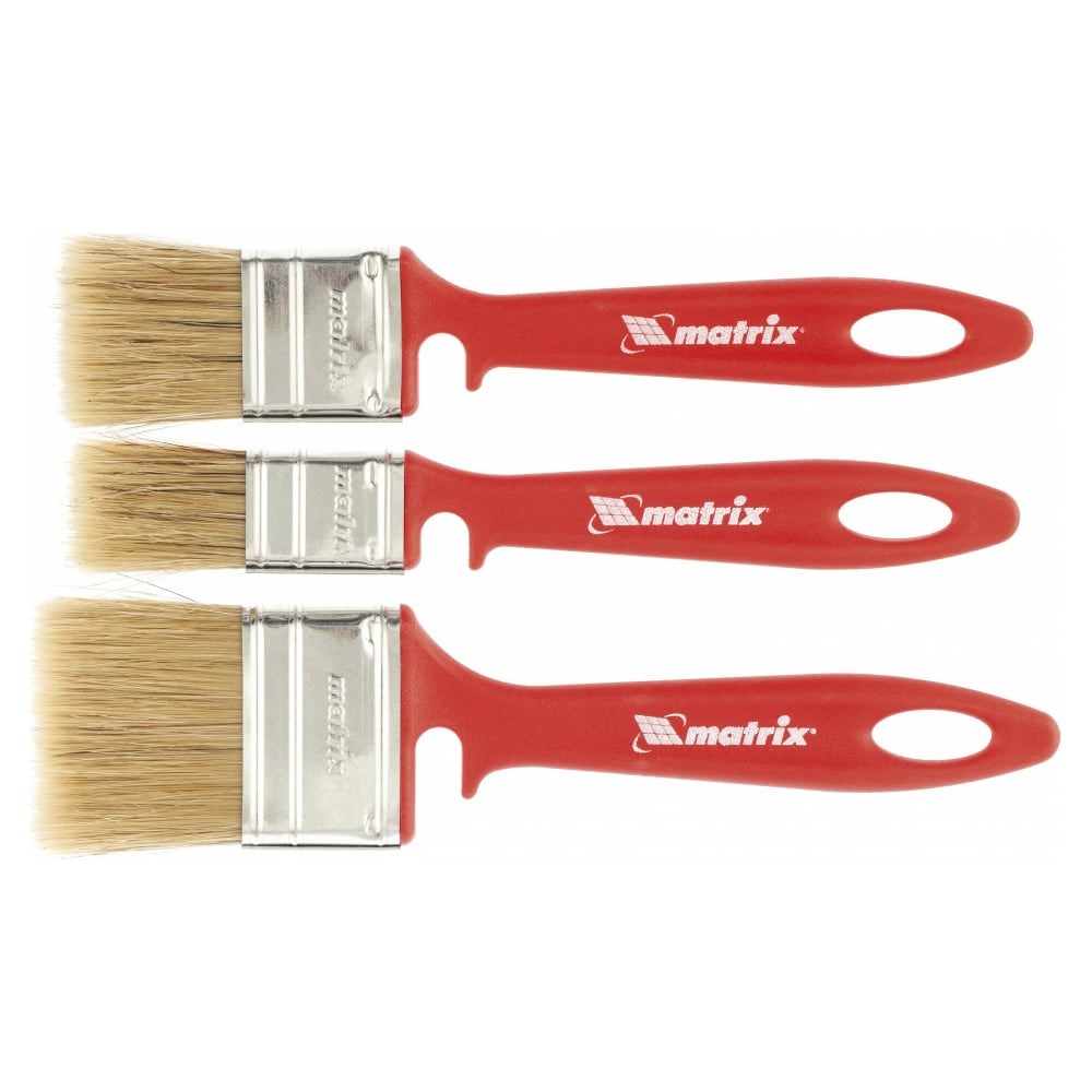Набор кистей «Эмали» 25мм, 35мм, 50мм MATRIX Color Line 83355 имеет специальный состав натуральных волокон, который разработан преимущественно для работ с данной группой ЛКМ. Кроме этого данная модель подходит для покрытий фасадов и деревянных конструкций. Каждая кисть имеет специальное углубление на рукоятке для удобного крепления на банку с краской.