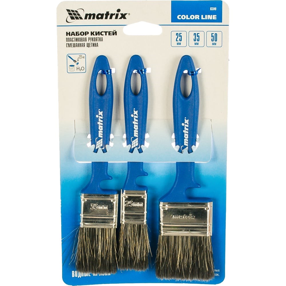 Набор кистей «Водные краски» 25мм, 35мм, 50мм MATRIX Color Line 83349 имеет специальный состав волокон для работ с ЛКМ на водной основе. Смесь натуральной и искусственной щетины оптимально подходит для покраски такого типа. Рекомендуется для покрытия деревянных конструкций. Данная модель имеет специальное углубление на рукоятке для удобного крепления на банку с краской.
