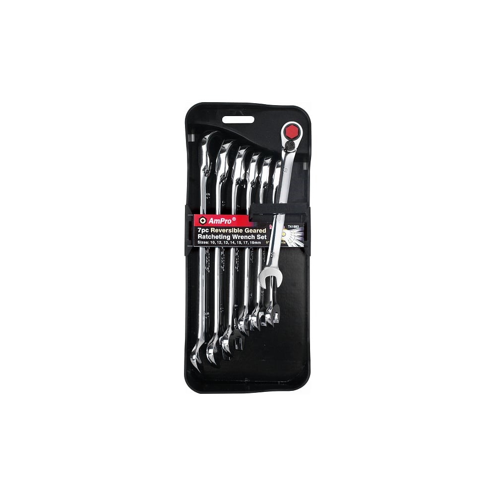 Набор комбинированных ключей AmPro с храповиком 10-19 мм 7 предметов T41683 упрощает работу с крепежом. Благодаря прочной стали инструмент выдерживает значительную нагрузку - можно вращать тугой крепеж. Головки точно соответствуют размерам. Это исключает люфт и последующее повреждение крепежа или инструмента.
