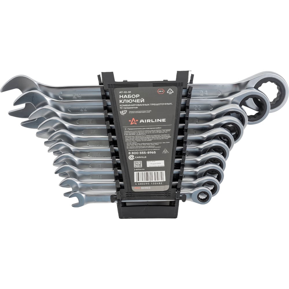 Набор ключей AIRLINE комбинированных трещоточных 10 предм. 8,10,12,13,14,15,17,19,22,24мм пласт.держат. AT-10-51 обеспечивает простой и эффективный монтаж крепежных элементов различного размера. Охватывает наиболее распространенный диапазон, что помогает монтировать типовые виды крепежа без дополнительного инструмента. Выполнено из прочной стали, имеет антикоррозийную защиту. Удобно держать в руках.