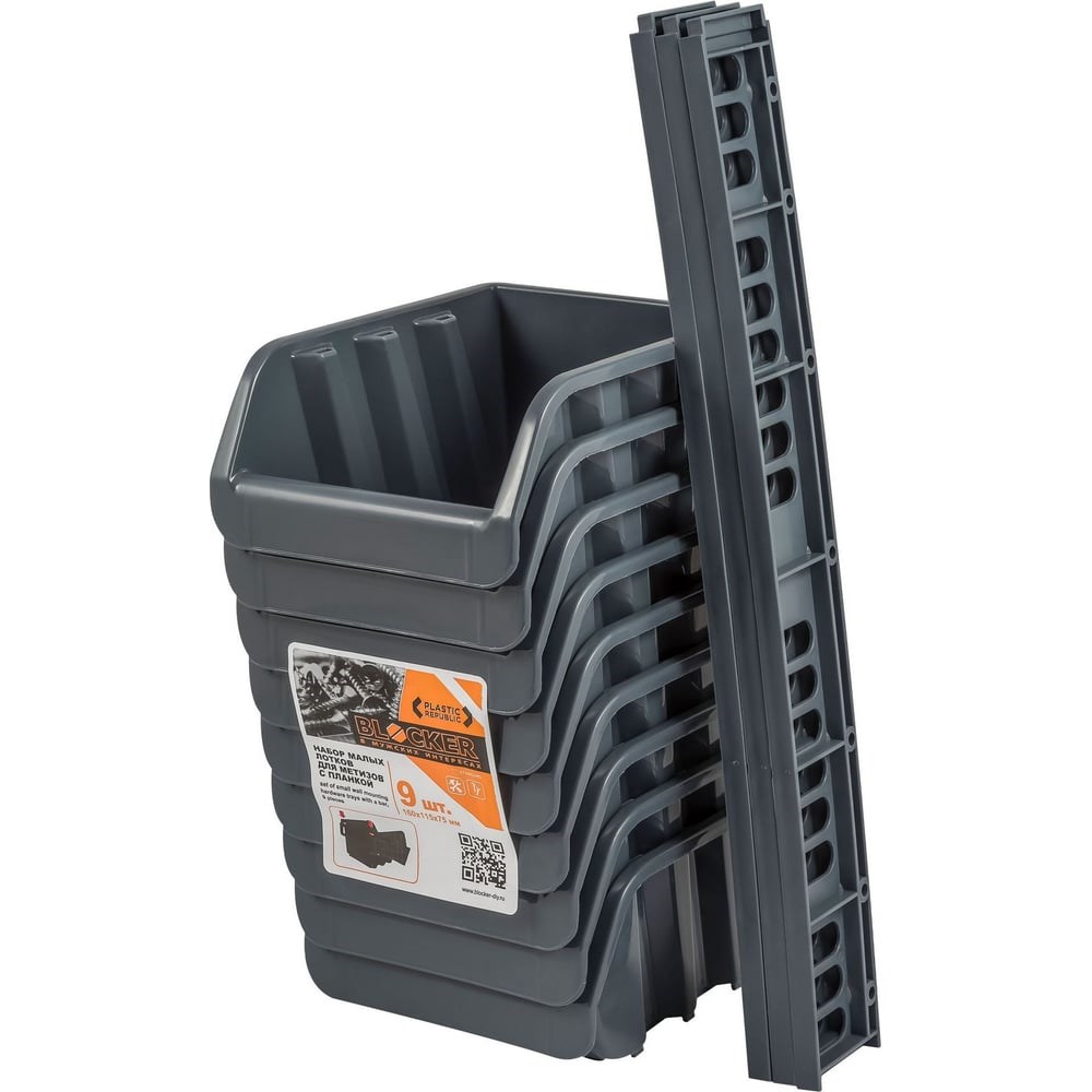 Набор малых лотков для метизов Blocker 9 шт, + в комплекте 3 планки для крепления к стене, серо-свинцовый, подойдет для распределенного хранения различных мелочей. Лотки идеальны для использования дома, на даче, в гараже, мастерской. Для экономии места на рабочем столе лоток можно подвесить на шину (планку), входящую в комплект, или установить сверху на другой лоток. Размер одного лотка - 160х115х75 мм. Размер упаковки из 9 штук -167х143х350 мм.