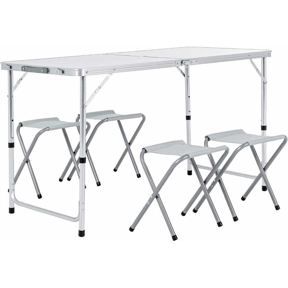 Удобный набор складной мебели просто незаменим для отдыха на природе. Набор включает в себя большой складной стол и четыре стула-табурета. Стол имеет прочный алюминиевый каркас и влагостойкую столешницу. Ножки регулируются по высоте. В центре стола есть отверстие для установки садового зонта. Стол легко складывается в компактный чемодан с ручкой для переноски, стулья помещаются внутри. Размер в сложенном виде (чемодан): 60x60x6,5 см Размер стола: 120x60x70/61/54см Регулируемые по высоте ножки; отверстие для зонта Материал стола: алюминиевая труба Ø25/Ø22Ø19 (толщина 0,8 мм) МДФ 4,5 мм Максимальная нагрузка на стол: 30 кг Размер стульев: 33x27x35см Размер поверхности стула: 27*23 см Материал стула: железная труба 18∅ (толщина: 0,5 мм); 600D Оксфорд Цвет: мраморный белый