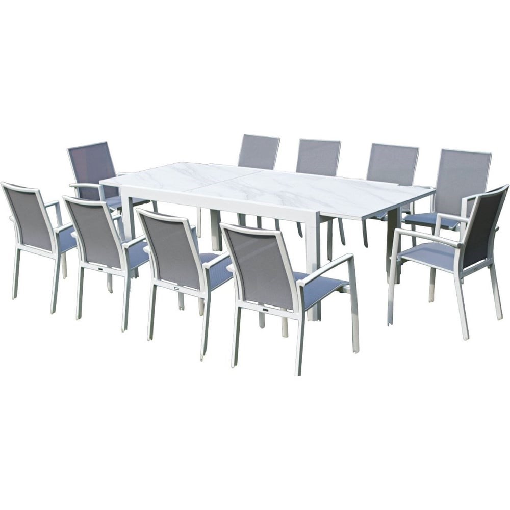 Набор мебели для сада Konway Denver: раскладной стол + 10 кресел, алюминий/керамогранит/текстилен. Стильный и практичный дизайн: обеденная группа Denver подойдет для отдыха на свежем воздухе. В комплект входит алюминиевый стол размером 180х100 см с керамогранитной столешницей, которую можно увеличить до 240 см, что позволит разместить большую компанию. 10 штабелируемых кресел с сиденьями из текстилена обеспечат комфорт и удобство для ваших гостей. Высококачественные материалы: комплект Denver выполнен из алюминия, керамогранита и текстилена, что гарантирует его долговечность и устойчивость к влаге и УФ излучению. Габариты и вместимость: стол имеет размеры 180(240)х100х75 см, а кресла – 60х57х90 см. Вместимость составляет 10 персон. Цвет и вес: комплект выполнен в белом цвете, что позволяет ему гармонично вписаться в любой интерьер. Вес набора составляет 98 кг. Выбирая набор мебели для сада Konway Denver, вы получаете стильный, практичный и долговечный комплект, который станет отличным дополнением к вашему отдыху на свежем воздухе.