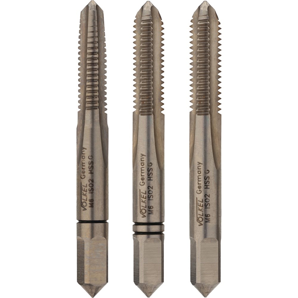 Набор метчиков из 3-х шт. VOLKEL предназначен для создания внутренней резьбы в различных материалах. Инструменты изготовлены из высококачественной быстрорежущей стали HSS-G, которая гарантирует прочность и износостойкость. Формирование резьбы происходит в 3 этапа: черновой метчик (6-8 ниток на заход), средний метчик (4-5 ниток на заход), чистовой метчик (2-3 нитки на заход). Благодаря этому, снижается усилие, прилагаемое к каждому метчику, а получаемая резьба более точная и чистая. Инструмент подходит для обработки заготовок, выполненных из нелегированной и низколегированной стали, алюминия, меди, бронзы, цинка, с пределом прочности до 900MPa.