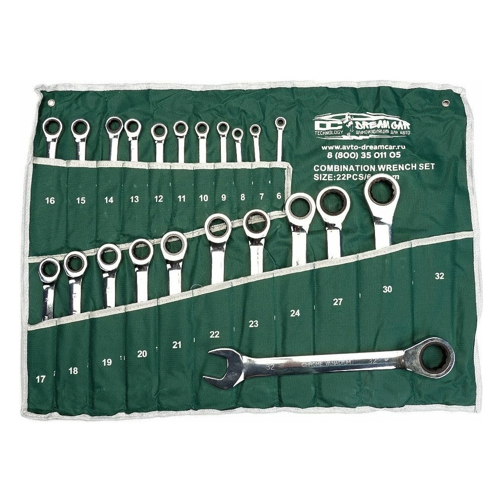 Набор накидных ключей с трещоткой Dreamcar зеленый, 6-32, 22 шт. DC-000-0694148 представляет собой набор специализированных инструментов для профессионального использования в процессе ремонта неисправностей транспортных средств и любых других ремонтных работ. Рабочая часть инструментов изготовлена из высокопрочной хромованадиевой стали, благодаря чему инструменты обладают прочностью и долговечностью. Для удобства хранения набор ключей размещён в сшитом из нетканого полотна чехле, каждый карман которого имеет цифровую идентификацию, соответствующую размеру ключа в нём хранящегося. Кроме того, чехол снабжён люверсовыми подвесами для закрепления на стене.