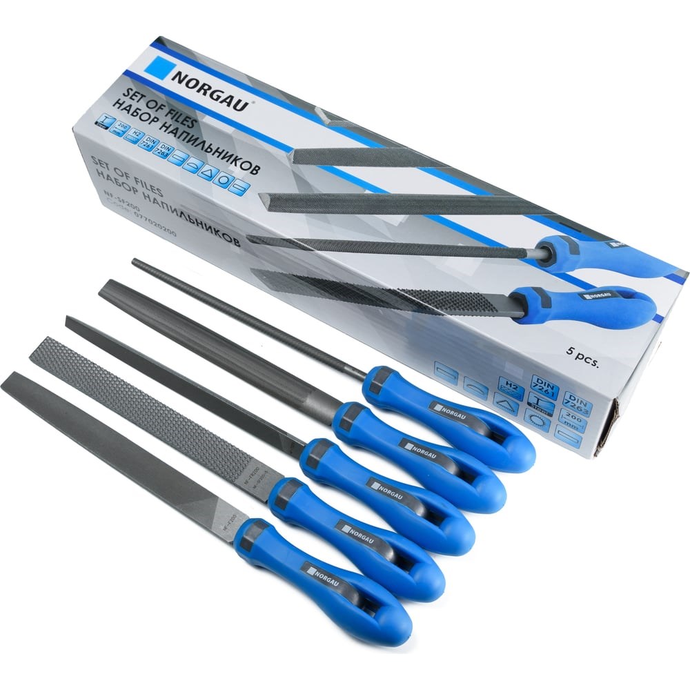 Набор напильников NORGAU NF-SF200 200мм H2, 5 предметов 077020200 предназначен для различных слесарных работ. В состав набора входит 5 напильников: плоский остроносый, трехгранный, полукруглый, круглый, плоский тупоносый. Разнообразие форм напильников поможет выполнить следующие операции: шлифование, снятие заусенцев, опиливание канавок и фасок и т.д. Напильнике в наборе с насечкой № 2 это точность 0,02-0,05 мм и снимаемый слой металла 0,02 - 0,06 мм.Изготовлены напильники их высококачественной инструментальной стали, что увеличивает срок эксплуатации. Комфортные двухкомпонентные ручки напильников оснащены защитой от выскальзывания и отверстиями для подвешивания.
