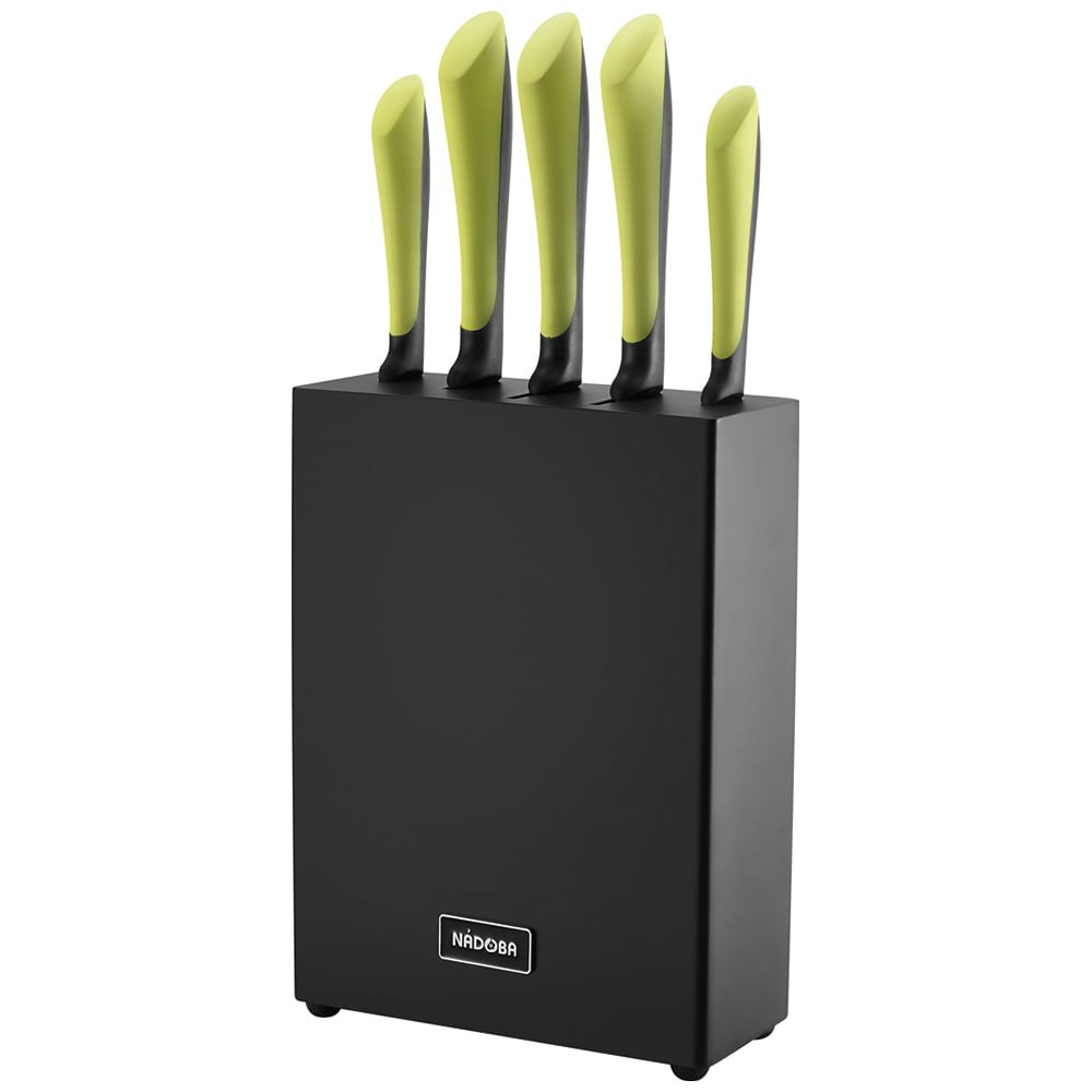 Набор ножей для кухни, 5 ножей и подставка, серия JANA 723117 Набор NADOBA серии Jana в универсальном блоке состоит из кухонных ножей: Овощной 9 см Универсальный 12 см Сантоку 17,5 см Разделочный 20 см Поварской 20 см Ножи выполнены из высококачественной стали X30Cr13 с высоким содержанием углерода. Благодаря этому коллекция ножей Jana обладает высокой твердостью 52- 54 HRC по шкале Роквелла и превосходными антикоррозийными свойствами. За счет пятигранного профиля и правильной толщины лезвий изделия характеризуются идеальным балансом и качественным легким резом. Длительное время не требуют заточки. Выполненные из высококачественного пластика ручки ножей устойчивы к механическим воздействиям и обладают гигиеническими свойствами. За счет гладкой поверхности и отсутствию пор ручки легко моются. Благодаря специальной противоскользящей резиновой вставке риски пораниться сводятся к минимуму. Блок для хранения ножей серии Jana исполнен из натурального дерева гевеи. За счет материала изделие отличается особой прочностью и почти не впитывает влагу. Стильный, функциональный блок покрыт безопасной нетоксичной краской. Ножи допустимо мыть в посудомоечной машине. Гарантия на набор 5 лет.