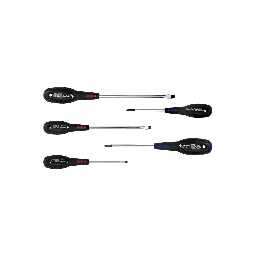 Набор отверток AmPro c антискользящей ручкой 5 предметов, крест и шлиц T32090 охватывает типовые шлицы. Инструмент удобен для эксплуатации в любых условиях. Прочное соединение стержня с рукояткой исключает срыв при работе с большим усилием и допускает безопасное вращение тугого крепежа. Отвертки имеют значительный ресурс и высокую прочность.