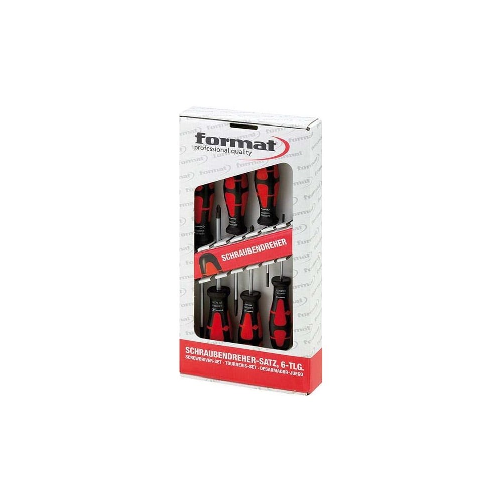 Набор отверток FORMAT SL, PH, 6 штук в упаковке 6354 0121.Состав набора:4 отвертки шлиц 2.5 x 75; 3 x 75; 4 x 100; 5.5 x 125 mm2 отвертки PH1.Изготовлено из высоколегированной специальной стали, что обеспечивает инструменту надежную защиту от коррозии.Круглое жало со специальным покрытием для увеличения крутящего момента.С 2-компонентной эргономичной ручкой Kraftkant для удобной и комфортной работы.