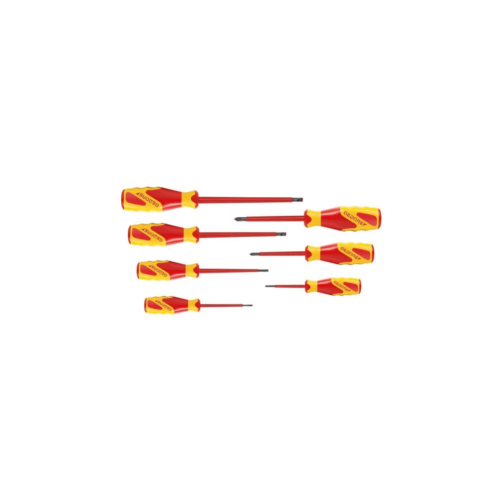 VDE-набор отверток IS 2,5-6,5 PH 0-2 GEDORE 1616048 включает в себя шлицевые и крестообразные отвертки с изолированными рукоятками для работы с крепежом. Особая форма трехкомпонентных рукояток исключает скольжение ладони во время время вращения.