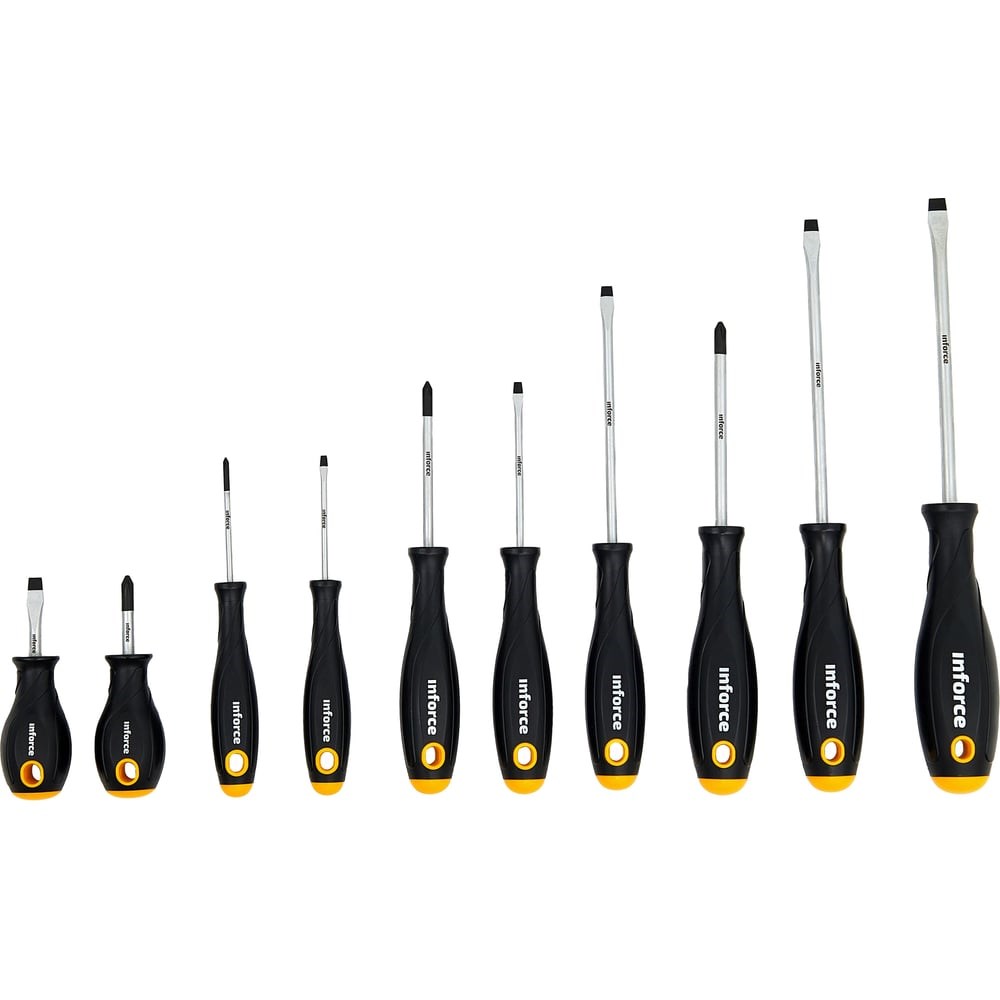 Набор отверток Inforce 10 шт 06-09-93 относится к инструментам профессионального класса. Каждое изделие имеет прочный стержень из CrMoV стали. Отвертки оснащены удобными рукоятками с отверстиями для вертикального хранения. Не скользят в руке во время работы, удобны при эксплуатации.