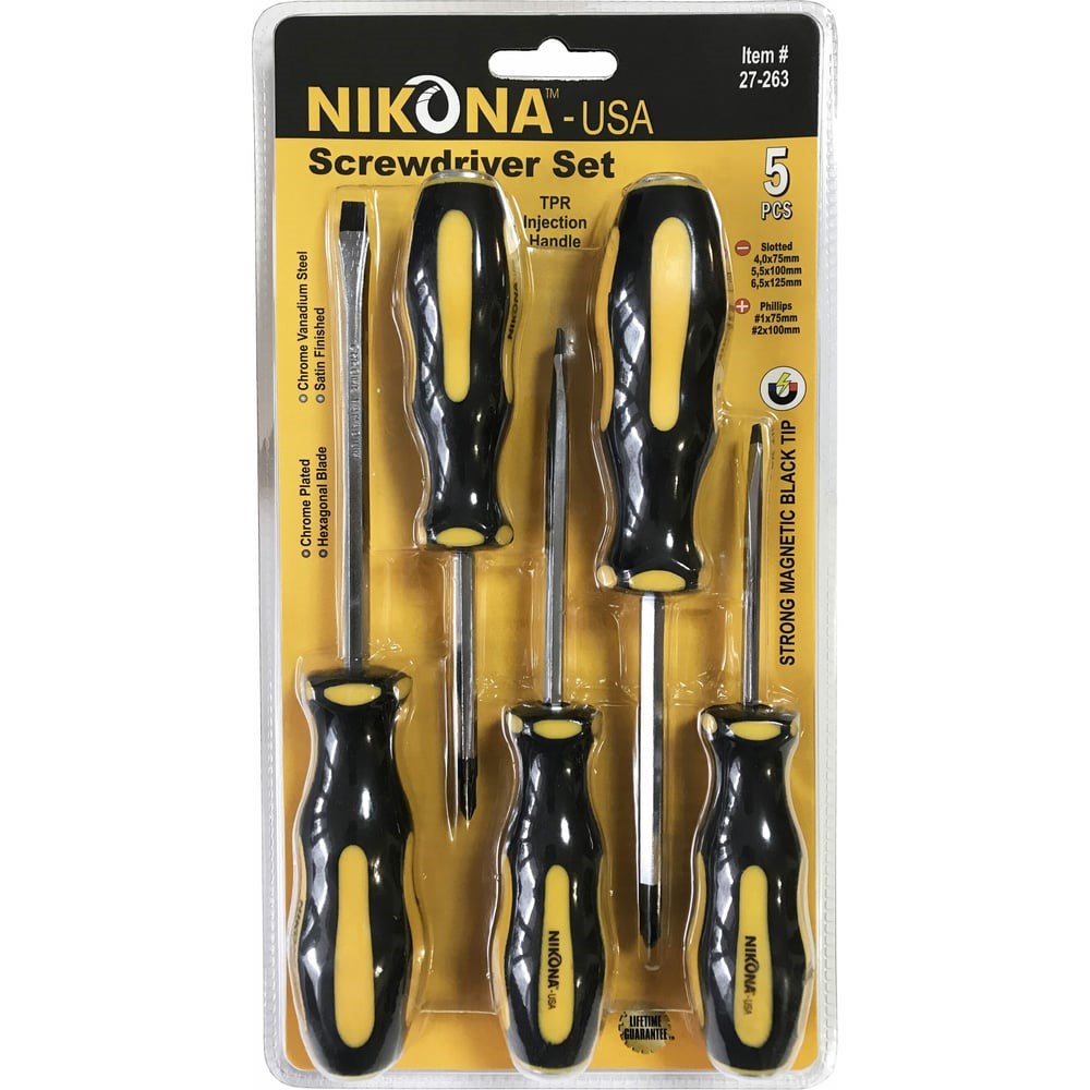 Набор отверток NIKONA из хромованадиевой стали 5 предметов 27-263 предназначен для работы с крепежом различных размеров при монтажных и демонтажных работах. Инструмент изготовлен из качественной хромованадиевой стали, что гарантирует прочность, стойкость к износу и долгий срок службы. Рукоятки выполнены из твердого и прочного TPR-пластика, стойкого к механическим повреждениям, растрескиванию и высоким температурам.