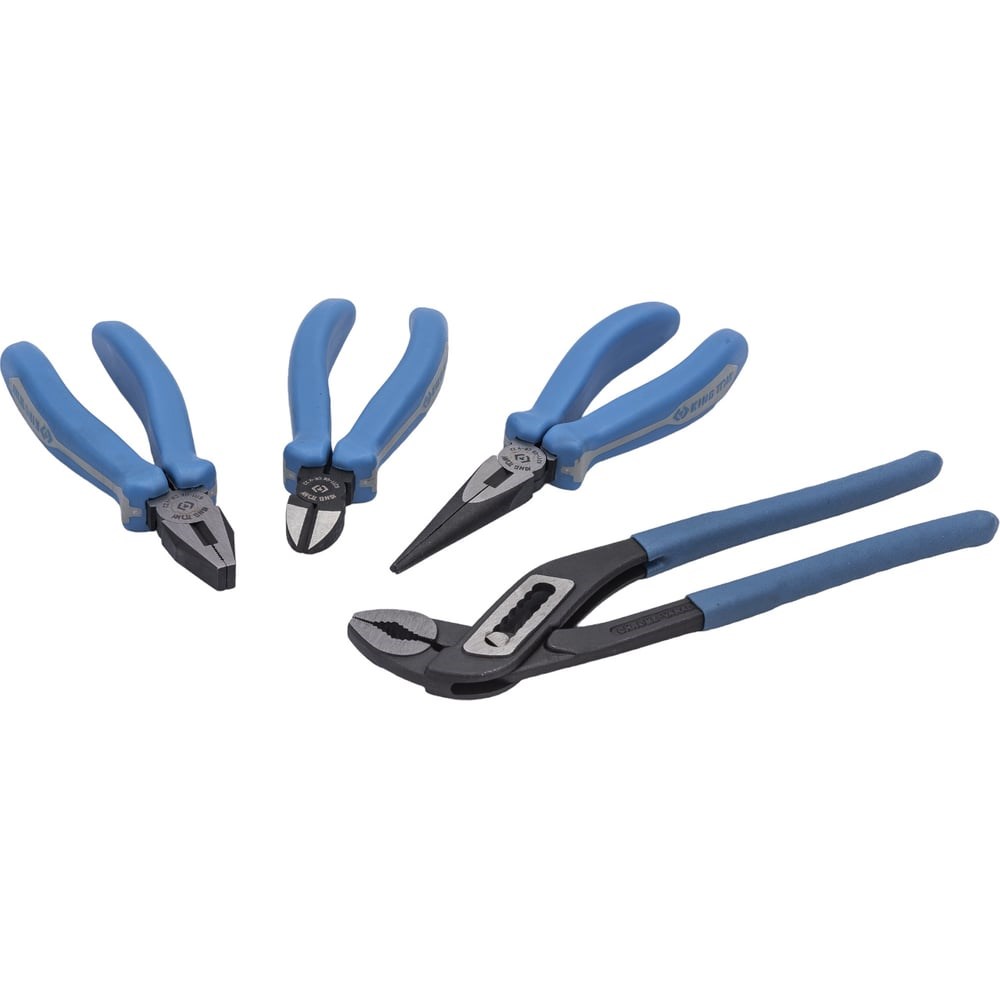 Набор пассатижей, плоскогубцев и бокорезов 4шт KING TONY 42104GP01 - комплект ручных шарнирно-губцевых инструментов для захвата, удержания и перекусывания различных деталей и заготовок при выполнении ремонтно-монтажных работ. Каждое изделие имеет прочные стальные рабочие части и удобные для обхвата ладонью эргономичные рукоятки. инструменты хранятся в удобном чехле с прозрачными карманами.