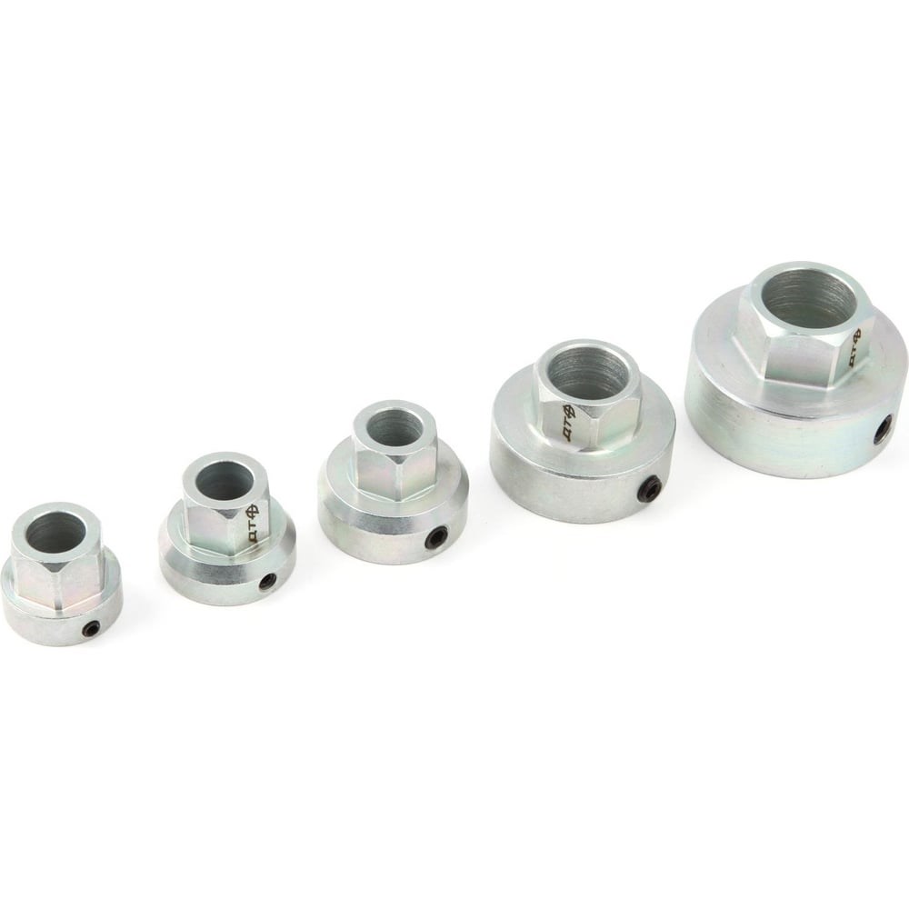Набор включает в себя 5 плашкодержателей для работы с плашками 20, 25, 30, 38 и 45 мм. В качестве привода плашкодержателя используются гаечные ключи и торцевые головки с различными удлинителями и карданами, а в качестве рукоятки можно применять вороток или трещотку. Благодаря этому данный инструмент, вкупе со сборной системой удлинителей, отлично подходит для работы в ограниченном пространстве. Плашкодержатели, внутренний диаметр: 20×7,5; 25×9; 30×12; 38×14; 45×18 мм Сталь 40Х Цинкование