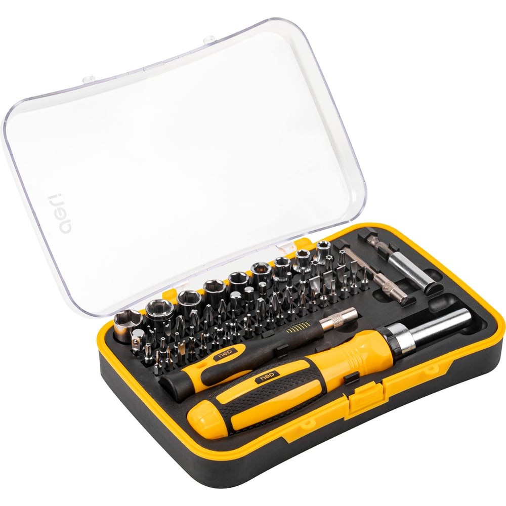 Набор прецизионных отверток DELI DL3565 65 предметов 98385 подходит для домашнего и полупрофессионального использования. Инструменты набора выполнены из качественной хромованадиевой стали, что обеспечивает высокую прочность и долговечность. Два удлинителя удобны для работы в труднодоступных местах. Благодаря резинопластиковой двухкомпонентной ручке отвертка удобно лежит в руке и не выскальзывает во время работ даже с самыми мелкими деталями.