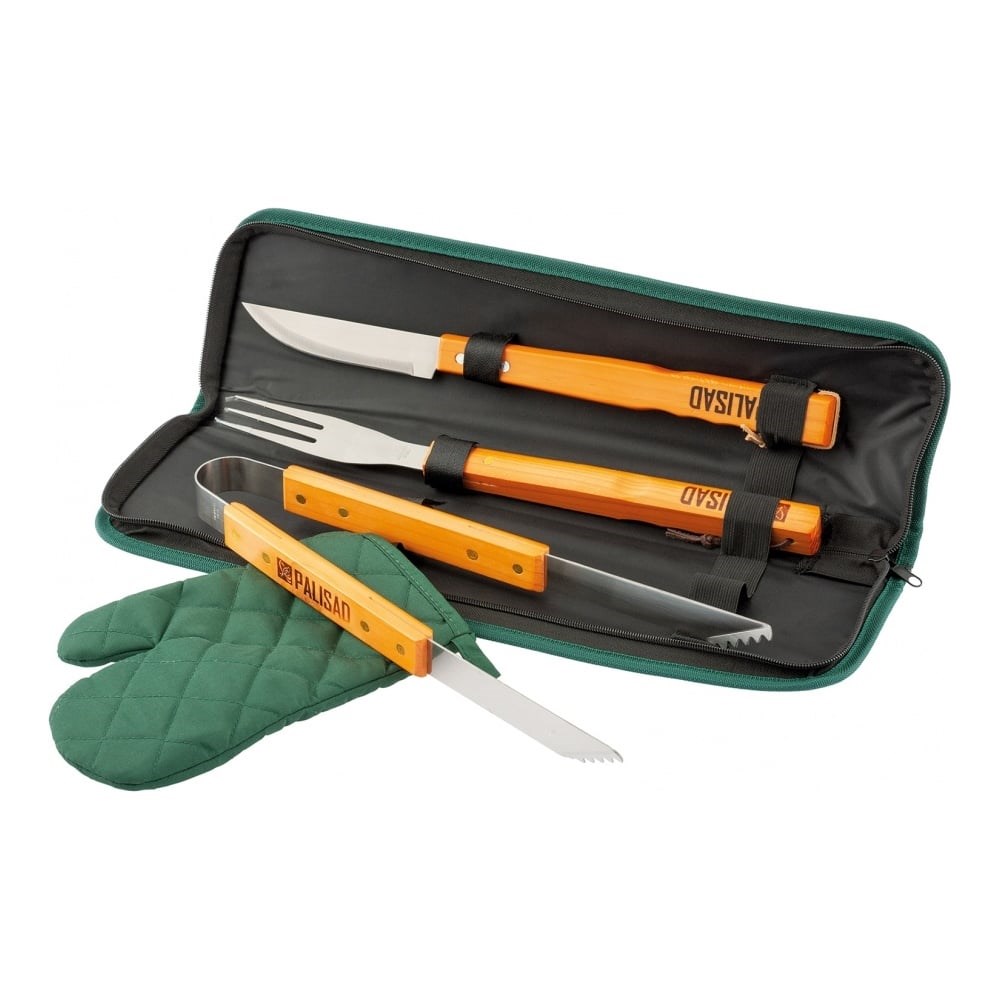 Набор приборов для барбекю Palisad Camping 69578 содержит 4 предмета в сумке, которые повышают безопасность и удобство приготовления блюд на мангале. Пригодится любителям пикников и дачникам. В наборе есть все необходимое: вилка для захвата продуктов и проверки степени их готовности, щипцы для переворачивания, рукавичка для удержания горячих предметов.