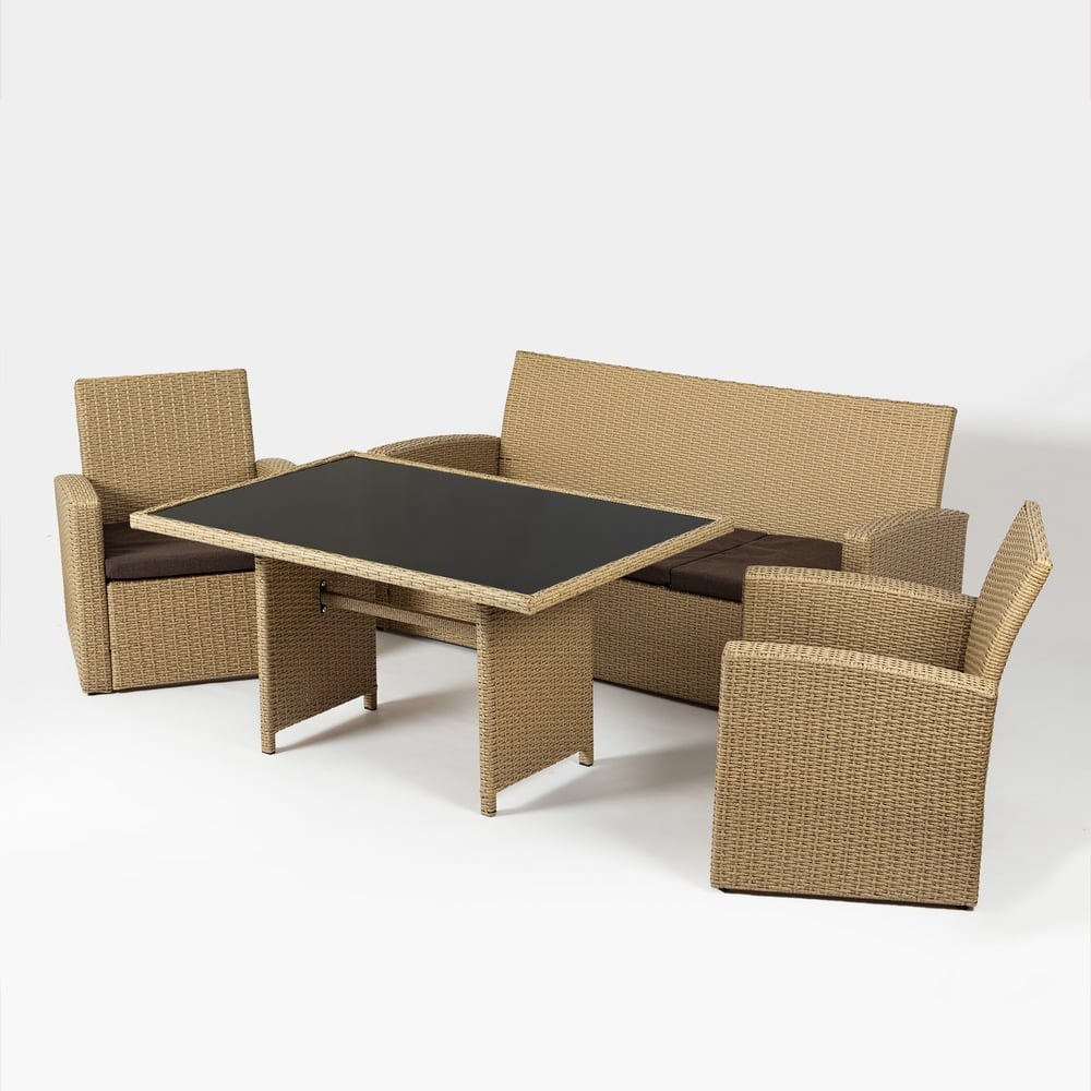 Набор садовой мебели Сицилия имеет прочный каркас: благодаря стальной раме с порошковым покрытием, комплект для отдыха прочен и долговечен. Легкая конструкция: благодаря легкой конструкции, мебель легко перемещать. Удобные подушки: съемные подушки сиденья обеспечивают оптимальный комфорт. Этот комплект для отдыха на открытом воздухе устойчив к атмосферным воздействиям и воде, его легко чистить и обслуживать. Цвет ротанга: бежевый Цвет подушек: коричневый Материал: полиротанг, сталь с порошковым покрытием Материал подушек: чехол из ткани рогожка с поролоновым наполнителем Устойчивый к ультрафиолетовому излучению Требуется сборка: Да Садовый диван с толстыми мягкими подушками обеспечивает уютную посадку. Съемный чехол: Подушки сиденья имеют съемные чехлы для легкой стирки и ухода. Садовые кресла из ротанга станут прекрасным дополнением к вашему открытому пространству. Благодаря своему прямому, стильному дизайну кресло добавит нотку современной элегантности вашему саду.