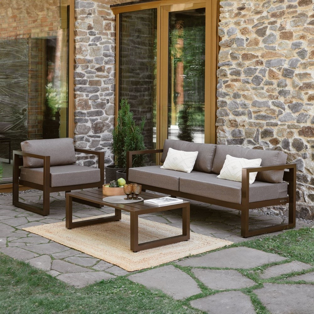В наборе садовой мебели CAPRI представлены диван, кресло и журнальный столик. Каркас мебели выполнен из высокопрочного алюминия, на сиденьях предусмотрены удобные подушки коричневого оттенка. Стильный уличный комплект подойдет для размещения трех человек. Алюминиевая мебель отличается долгим сроком службы, подходит для сада, террасы, бассейна. Комплект мебели органично впишется в интерьер загородного дома, клуба, ресторана, отеля. Набор доставляется в собранном виде в надежной упаковке.
