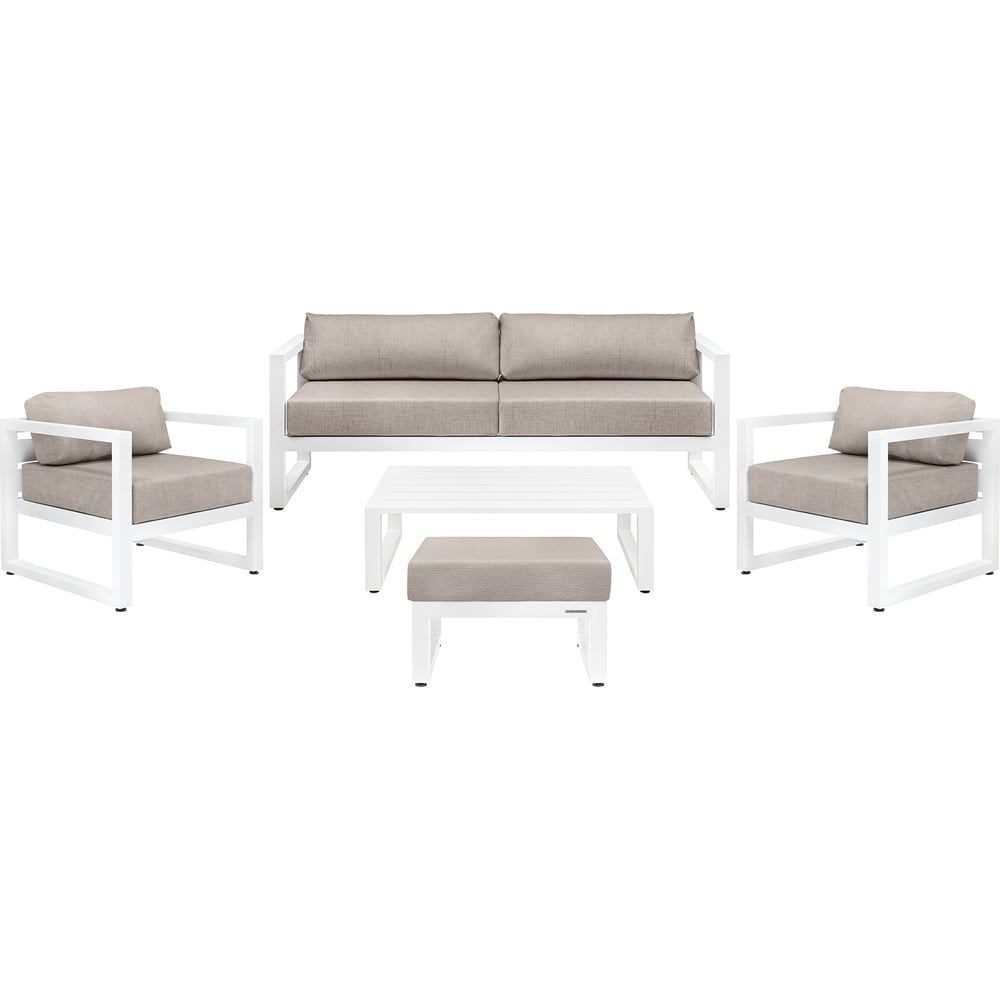 В большом наборе садовой мебели CAPRI представлены диван, 2 кресла, пуф и журнальный столик. Каркас мебели выполнен из высокопрочного алюминия, на сиденьях предусмотрены удобные подушки пепельно-коричневого оттенка. Уличный комплект создает комфортную зону для отдыха в саду, на террасе, у бассейна, подойдет для размещения шести человек. Алюминиевая мебель органично впишется в интерьер загородного дома, клуба, ресторана, отеля. Набор доставляется в собранном виде в надежной упаковке.