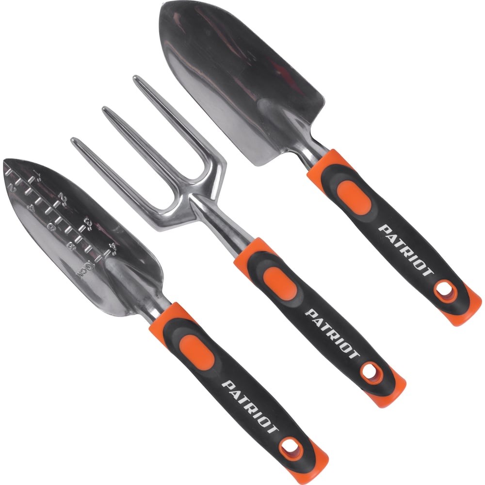 Набор садового инструментаPatriot GTP 3 с алюминиевым цельнолитым корпусом предназначен для ухода за растительностью на клумбах, грядках, в парниках и теплицах. Рабочая часть выполнена из литого под давлением алюминия и устойчива к ржавчине, что обеспечивает долговечность и износоустойчивость. Цельнолитая конструкция и утолщенные стенки рабочих частей обеспечивают надежность инструментa. Двухкомпонентная из термопластичной резины устойчива к воздействию ультрафиолета, ядохимикатов и агрессивных растворов. Удобная и эргономичная рукоятка не скользит в руках, обеспечивая комфортное использование. Для удобства хранения предусмотрено отверстие для подвешивания. Лопатки предназначены для посадки и пересаживания растений. Для удобства пользователя на рабочую часть узкой лопатки нанесена измерительная шкала, которая позволяет соблюдать нужную глубину при посадке. Посадочная вилка позволяет аккуратно рыхлить грунт и пересаживать растения, не повреждая корневую систему.