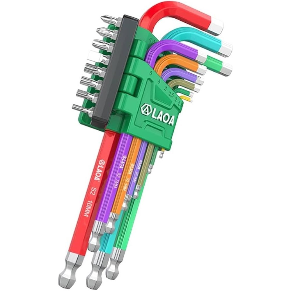 Набор шестигранных ключей, с цветовой индикацией и ответной головкой. Цветовая индикация хорошо помогает в быстром выборе нужного размера ключа. Шарообразная головка позволяет вставлять ключ и работать под углом к оси винта до 25 градусов. В комплект входит набор бит PH 1 PH2 PH3 T30 T25 T20 T15 SL 5 Встроенное в шестигранник крепление для бит,поможет заменить 8 отверток и освободит место в инструментальном ящике - сумке. Незаменимый набор для мебельщика, столяра,автослесаря,любителей велоспорта и мотоциклистов.