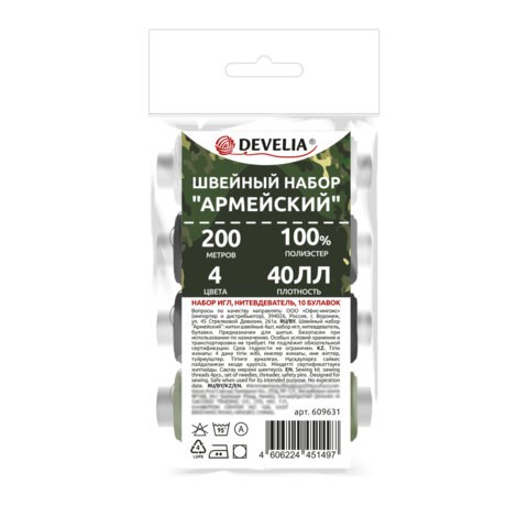 В набор "Армейский" входит 4 катушки ниток 40ЛЛ в намотке 200 м стандартных цветов (черный, белый, серый, зеленый), иглы для ручного шитья разных размеров - 15 штук, нитковдеватель, 10 булавок. Поставляются в полипропиленовом пакете.