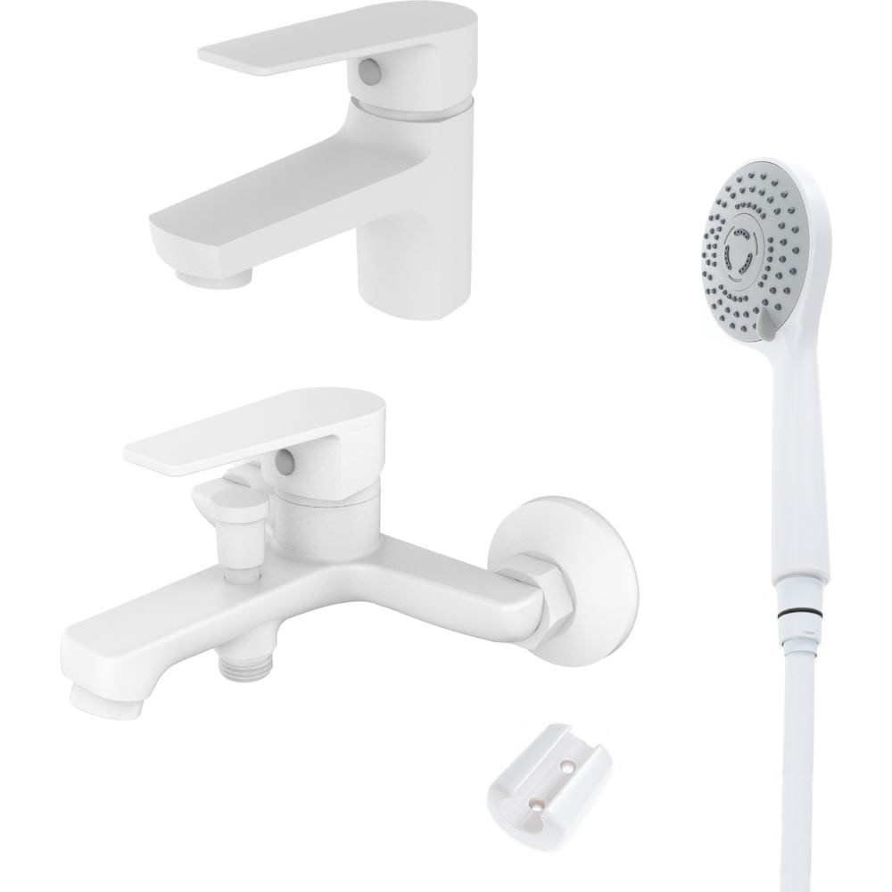 Набор смесителей для ванной комнаты Loop от немецкой компании Orange – отличный выбор для современного интерьера.Латунное изделие устойчиво к коррозии и высоким температурам, а покрытие в цвете глянцевый белый делает незаметными разводы и высохшие капли. Керамический картридж обеспечивает долговечность изделия, стабильную подачу воды и мощный напор. Излив оснащен пластиковым аэратором, он создает ровную мощную струю и легко очищается от известкового налета.В комплекте душевой набор: душевая лейка d90 мм (3 режима струи, защита от известкового налета RUB CLEAN, с системой AIR IN), шланг ПВХ 1500 мм с защитой от перекручивания, настенный держатель лейки.
