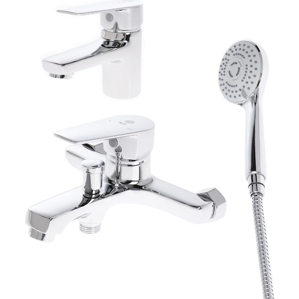 Набор для ванной комнаты Orange Loop 3х1 цвет глянцевый хром:1) Смеситель для умывальника однорычажный с керамическим картриджем (высота излива 54 мм, длина 96 мм).2) Смеситель для ванны/душа (излив 170 мм) однорычажный с керамическим картриджем и керамическим дивертором.3) Душевой набор: ручной душ d90 мм (3 режима), настенный держатель душа, шланг 1500 мм в металлической оплетке, с защитой от перекручивания.