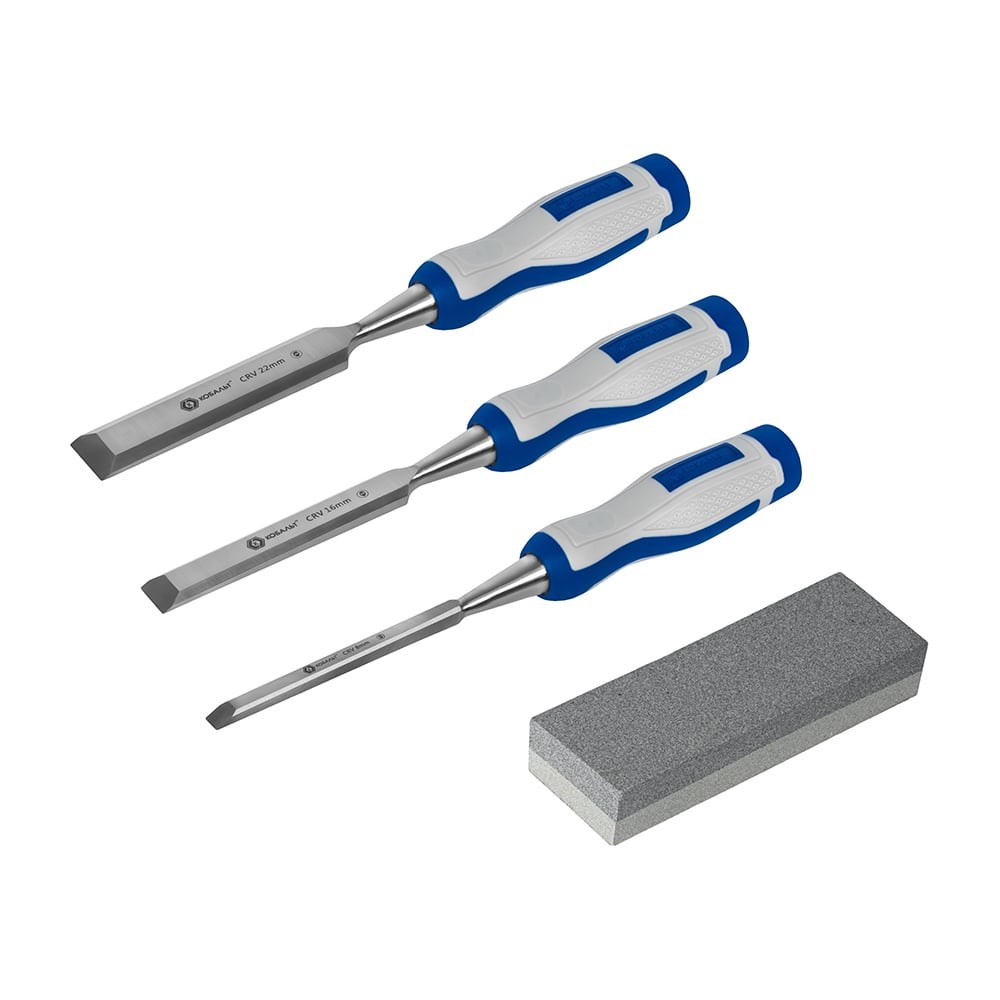 Набор плоских стамесок: 8, 16, 22мм, длина 140мм, CR-V, двухкомпонентные рукоятки, точильный камень, 3шт, кейс КОБАЛЬТ 245-688 - комплект прочных, надежных и долговечных деревообрабатывающих инструментов с удобными двухкомпонентными ручками. Рабочие части стамесок изготовлены из высокопрочной хром-ванадиевой стали, режущие кромки острозаточены и надолго сохраняют свои качества.