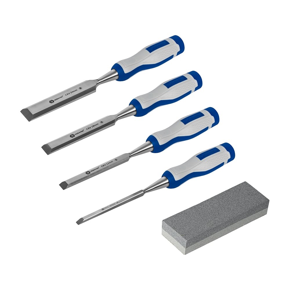 Набор плоских стамесок: 6, 12, 18, 24мм, длина 140мм, CR-V, двухкомпонентные рукоятки, точильный камень, 4шт, кейс КОБАЛЬТ 245-695 служит для работ по дереву - выдалбливания пазов, отверстий, вырезания узоров и пр. Рукоятки из двухкомпонентного материала обеспечивают крепкий хват без скольжения в ладони мастера.