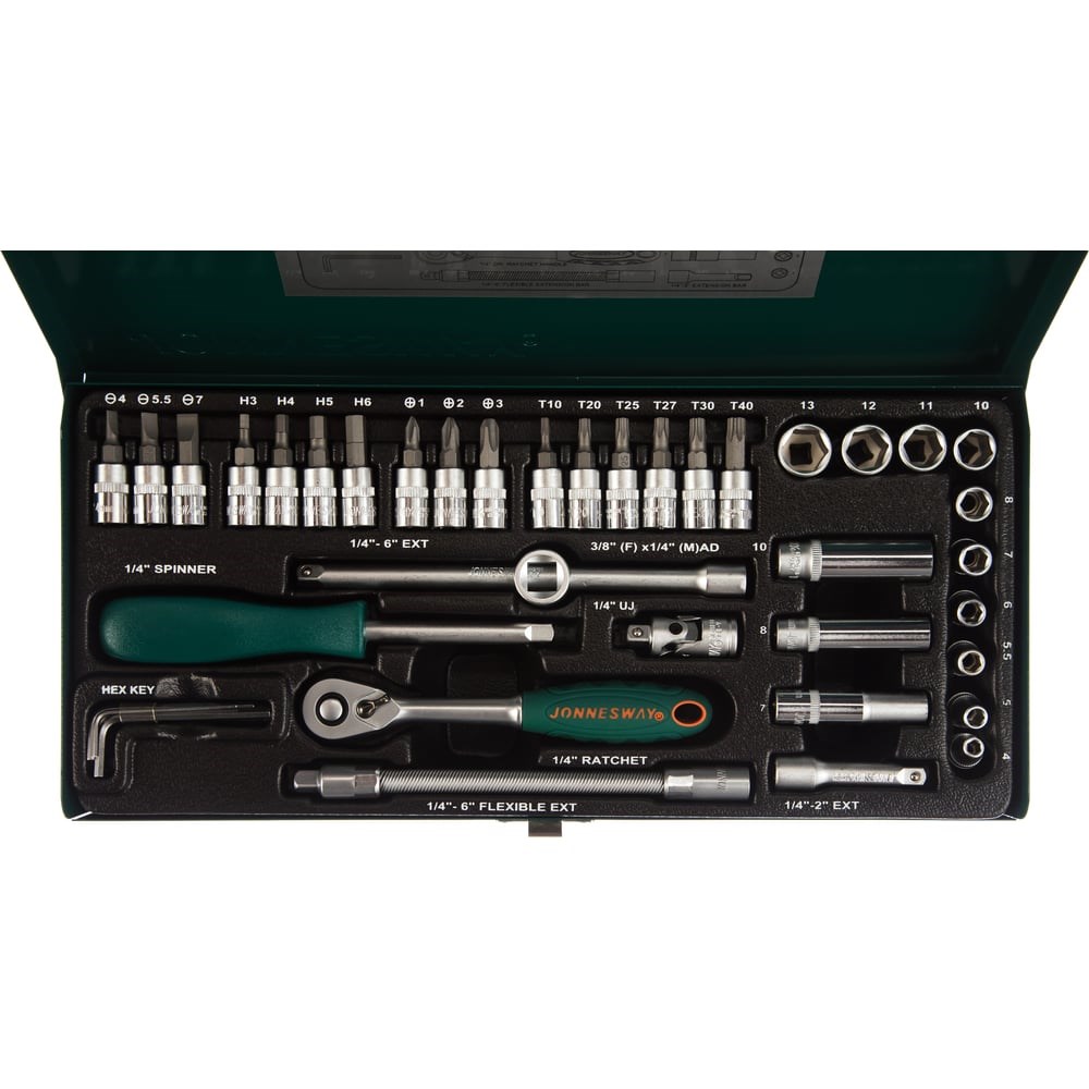 Набор торцевых головок 1/4"DR 4-13 мм Jonnesway S04H2141S состоит из сорока одного предмета и является незаменимым помощником при ремонте автомобиля, мотоцикла или велосипеда. Чемодан упрощает хранение и транспортировку набора.
