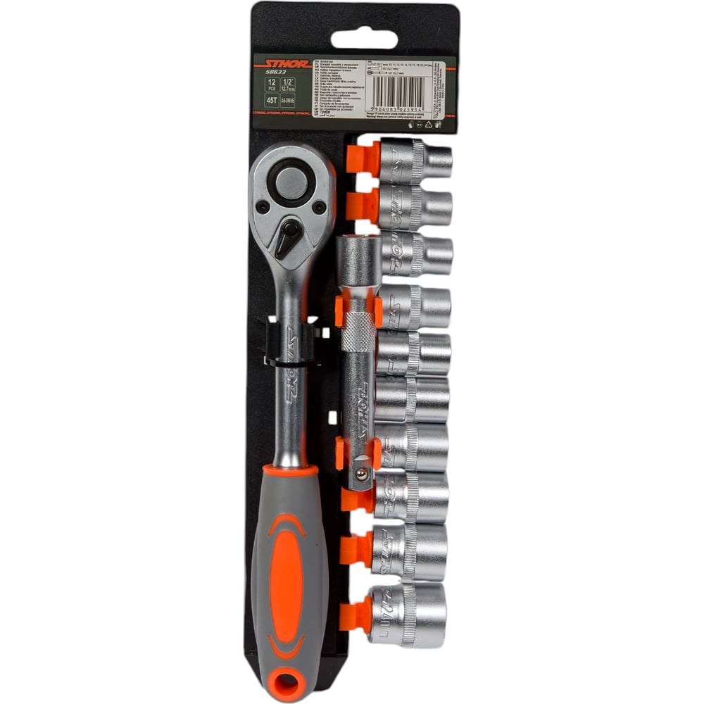 Набор торцовых головок STHOR 1/2 с трещоткой 12 предметов 58633 включает в себя штампованные закаленные головки. Также есть инструмент, изготовленный из CrV 50BV3 стали. Этот сплав устойчив к коррозии и достаточно вынослив при силовых работах. Головки имеют специальную форму AS-Drive. Это позволяет работать с меньшим усилием, а также меняет угол давления на крепеж, что снижает риск срыва.