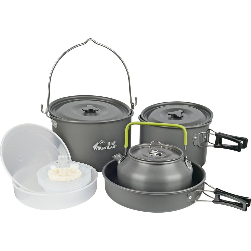Набор туристической посуды 15 предметов для туризма, кемпинга, рыбалки и альпинизма. Имеет откидные переносные ручки с термоизолирующим покрытием, которые экономят объем при транспортировке, делая использование посуды более комфортным. Изготовлен из высококачественного алюминия с анодированным покрытием, обеспечивающим надежную защиту от коррозии и царапин, а также предотвращающим окисление алюминия, не допуская его попадания в организм человека. Большой котелок - 215x140мм (4.2л) Кастрюля - 190x120мм (3.2л) Чайник - 165x90мм (1.2л) Сковорода - 220x50мм (1.5л) Особенности: Комфортная эксплуатация в дальних путешествиях Легко моется малым количеством воды Удобный тканевый чехол для переноски