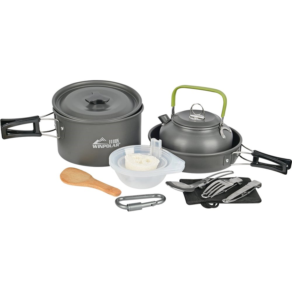 Состав наборакастрюля - 1шт, чайник - 1шт, сковорода - 1шт, пластмассовые тарелки - 3шт, складной пластмассовый половник - 1шт, губка - 1шт, деревянная лопатка - 1шт, складные столовые приборы (вилка, ложка, нож) по 1шт